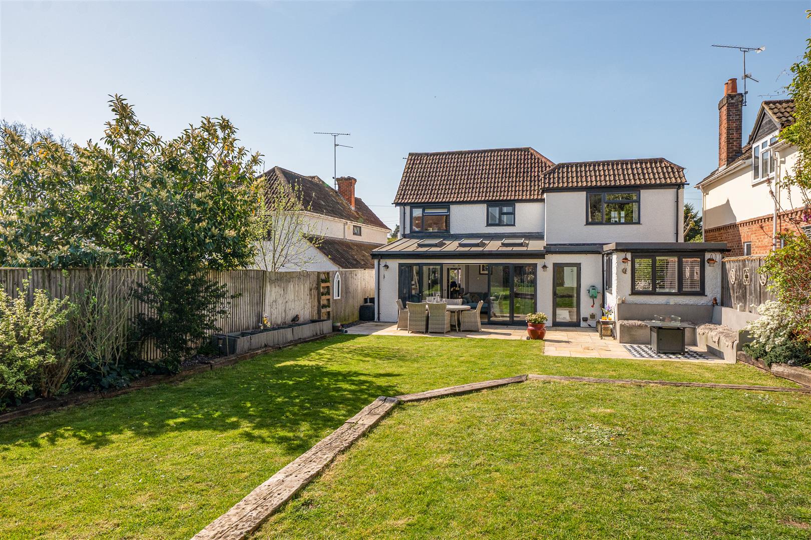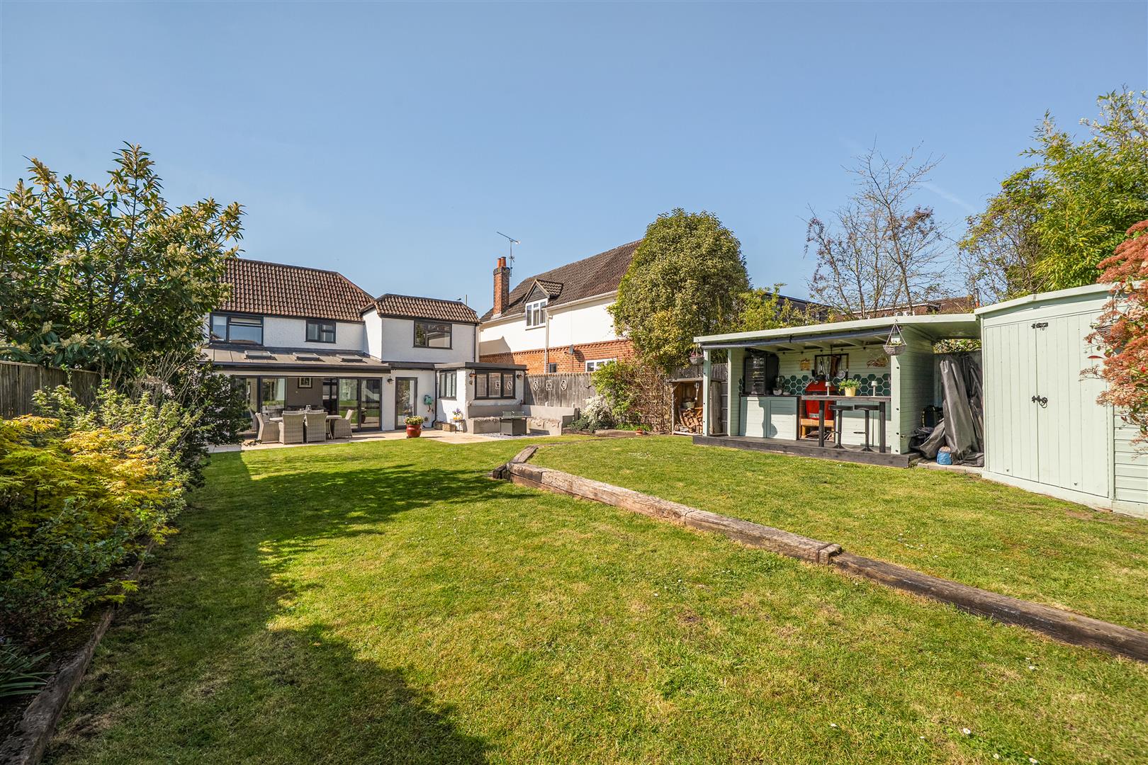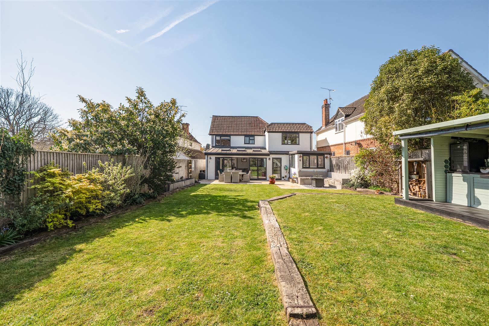 This stunning four-bedroom detached character residence has been thoughtfully enhanced to deliver flexible, stylish living throughout. The accommodation includes a generous sitting room that flows seamlessly into a bright kitchen/dining area, open plan to a large family space with bi fold doors opening onto the rear garden. This is complemented by a separate utility room, cloakroom, and a dedicated study. The first floor comprises four well proportioned bedrooms, all featuring fitted wardrobes and served by a modern family bathroom. The master and second bedrooms further benefit from stylish en suite shower rooms. Externally, the beautifully landscaped rear garden is thoughtfully planted and includes a covered outdoor kitchen with BBQ/bar area, along with a storage shed. To the front, a substantial driveway provides parking for multiple vehicles, in addition to a bin store and an attached garage.
