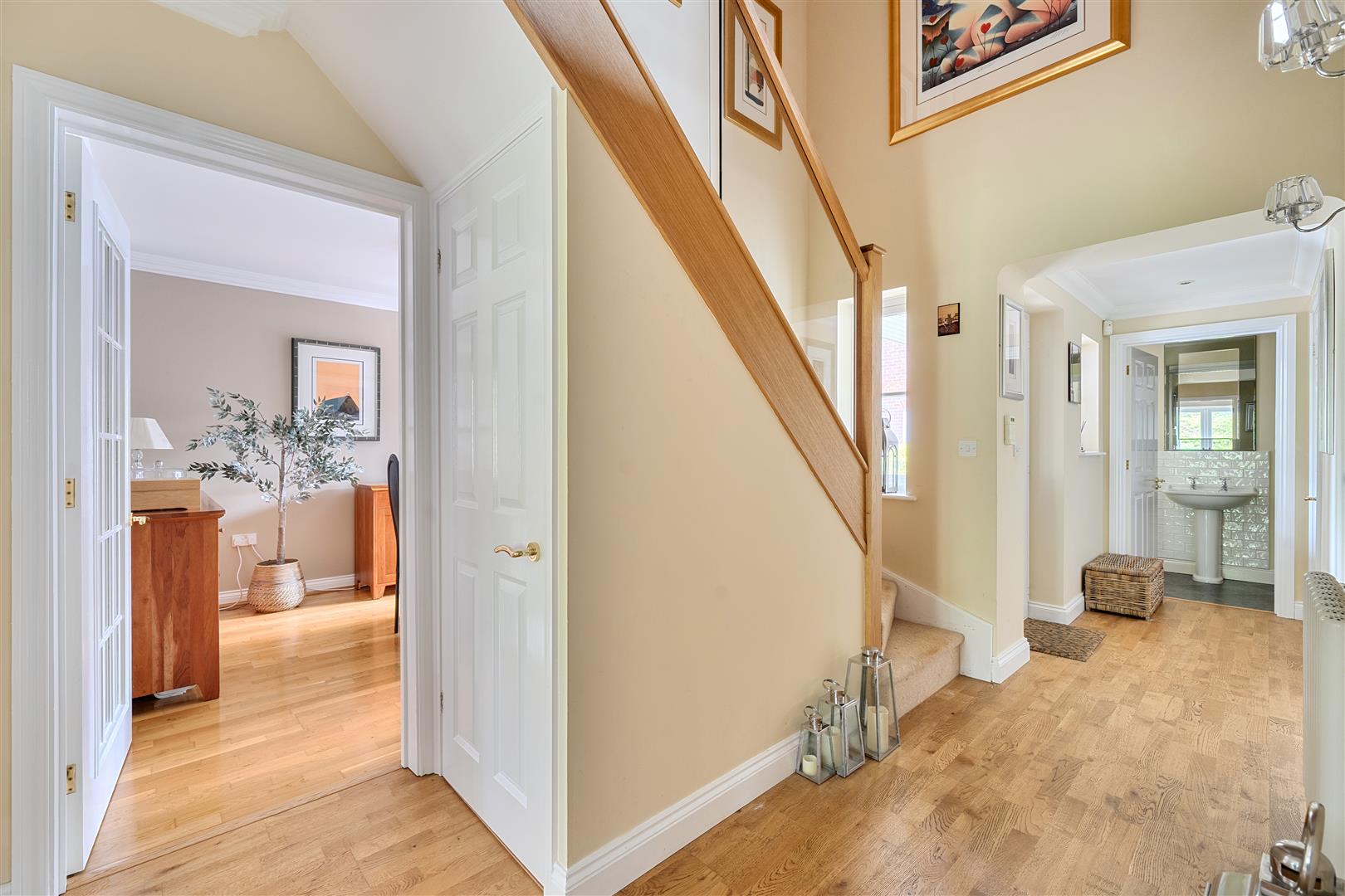 This impressive and spacious five bedroom detached family home offers extensive and versatile accommodation, ideal for modern family living. The ground floor features multiple reception rooms, including a generous living room, separate dining room and an additional drawing room, providing excellent space for both entertaining and everyday use. A well appointed kitchen/breakfast room sits at the heart of the home, complemented by a utility room and cloakroom. A standout feature of the property is the striking glass staircase, adding a contemporary and stylish focal point to the home. Upstairs, there are five well proportioned bedrooms, with one currently fitted as a study, including a substantial principal suite with en suite, along with a second ensuite to bedroom two and a family bathroom serving the remaining bedrooms. The layout is well designed to accommodate family life, offering both space and flexibility.